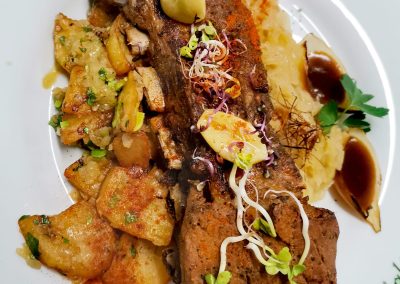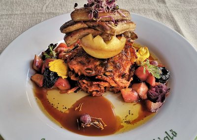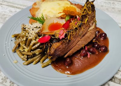 Étlapunk fő célja a kultikus magyar ízvilág bemutatása illetve a már feledésbe merülő tradicionális ételek újragondolása. A konyhánk egy nagy kemencével büszkélkedhet, ahol hagyományos módon sütjük a kenyereket, csülköt, csigánypecsenét, házi réteseket, legyen az sós vagy édes és még sok más ínyencséget. A legízletesebb ezek közül a marhahúsleves, mely egész éjszaka a parázs melegében varázsolja egybe a páratlan ízt. Étlapunkban a szezonális ajánlatok mellett megtalálja vegetáriánus, liszt-, és tejmentes ételeinket is. Tekintettel a családi vállalkozásra, a konyhát a fiunk vezeti, aki 5 éves külföldi tapasztalatait csempészi be a magyar konyha remekeibe. Számára a legfontosabb az anyag, az íz, a szín,és a textúra kompozíciója, melyet fejben megalkot. A kreativitása mint ízben, mint formailag határtalan, ezért az étlapban folyamatosan frissülnek a szezonális ajánlatok, hiszen számára a legfontosabb a vendég maximális elégedettsége.