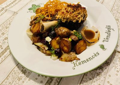 - Kemencés tál: Gödöllői töltött csirkecomb, Parasztgordon, Baconba tekert csirkemellfilé, Rántott gomba