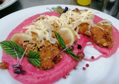 - Kemencés bőségtál: Kacsacomb kemencében sütve, Cigánypecsenye kakastaréjjal, Tökmagos csirkemell csíkok, Rántott karfiol és gomba